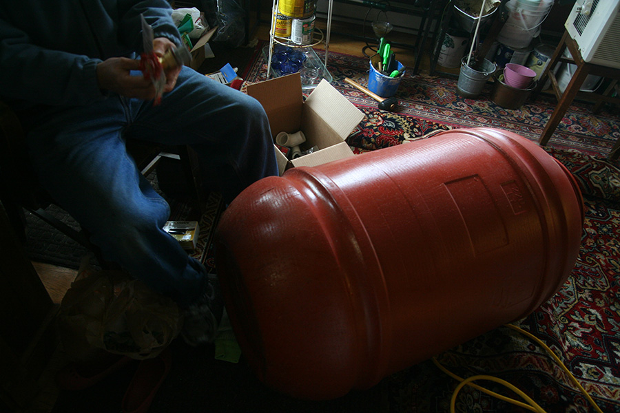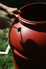 after the hole was properly sized, we took turns crawling inside the barrel to get a sense of how the spigot will be attached. barrels are easier to get into than to get out of. my arms would get stuck inside the opening; definitely not a job for claustrophobics. when my father tried to get out, at one point i was afraid he was stuck in there for good until i managed to pull the barrel up over his head.