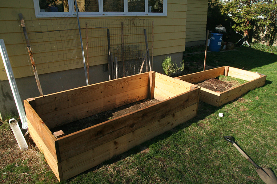 finally we assembled the 4th and last raised bed. we discovered an easier way to join the pieces together by stacking them on top of an already-assembled frame. in the future, a better place to work would be the flat surface of the driveway. it was interesting to see just how tall a stacked frame is, approximately 24". this is just a little bit taller than the height of my original raised bed idea, a 20" tall box. in hindsight, that would've been too tall; the height we have now at 12" i think is just right.