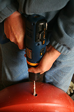 the first rain barrel we worked on required drilling a hole big enough to fit a 1/2" sillcock spigot. this is only because we had a spare sillcock which saved us from having to buy one more. the only problem was we didn't have a drill bit of the right size. after drilling in the initial hole, we realized it was too small so my father kept tracing the perimeter of the hole with the drill bit, slowly expanding the opening.