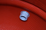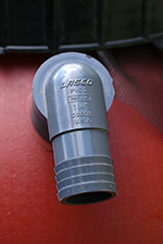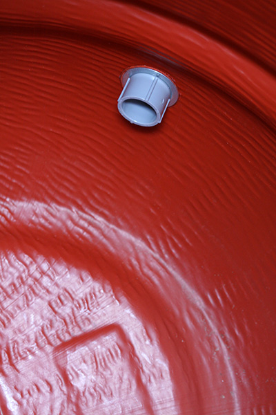 next we drilled the overflow hole on the top of the rain barrel. originally we wanted a 1-1/2" hole for maximum drainage, but we couldn't find an elbowed insert spout matching that size; lasco (the company that makes insert fittings) does make these but they're specialized enough that home depot doesn't sell them. so instead we decided on a 1-1/4" fitting, a little smaller, but still a good size. this size also matches the 1-1/4" 24 ft-long black sump pump hose i bought.