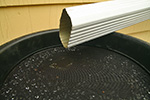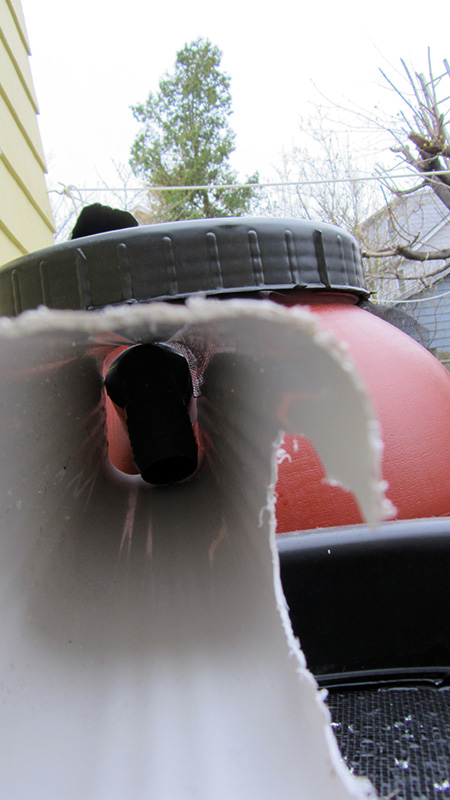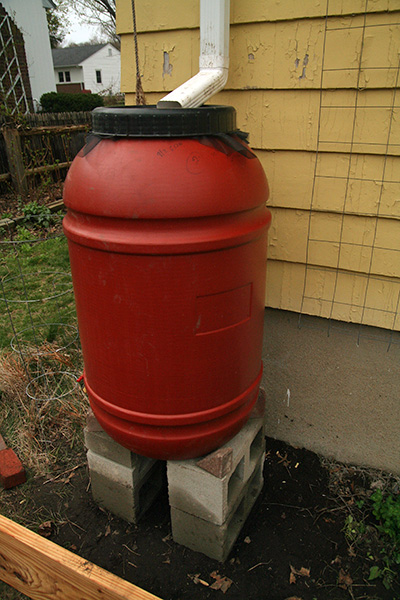 one of the double barrels near the center of the house is almost to capacity (about 4/5 full). that was quick! i didn't think it rained all that much yesterday and even late last night it seemed kind of dry. i guess it was a good idea to put 2 barrels here since it looks like this particular downspout gets the most rain. we don't have the necessary hose yet to connect the two barrels, so in the meantime my father rigged up a makeshift connect using a broken length of plastic downspout. as soon as the first barrel overflows, the water will be diverted to the screened lid of the second barrel. it's fun that we're collecting all this rain but with nothing growing in the garden yet, it's water we have no use for.