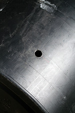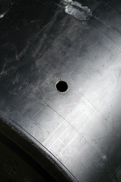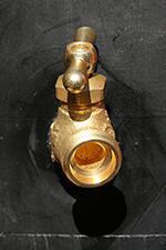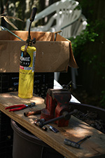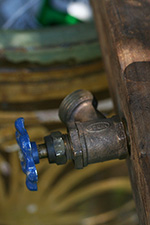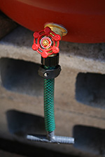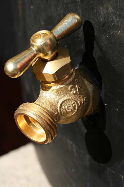 attaching a spigot to the black rain barrel was supposed to be easy: we had all the necessary tools plus the previous experience drilling spigot holes for the other barrels. what we didn't count on was just how thick the wall of the black barrel was. first it took a while to drill the 15/16" hole. then we soon realized the 3/4" threaded end of the no-kink hose bibb wouldn't fit. my father had to file away the edge of the hole to make it bigger. it took a while to finally thread in the hose bibb, but it went it a little crooked, like the leaning pisa tower of rain barrel spigots. it wasn't that big a deal, it still worked, but we sealed the edge with some silicone caulk just in case. the spigot as so difficult to attach that my father had bruises on his palms from trying to turn and press the hose bibb through the hole. for our other black barrel, we're looking into buying a 3/4" thread tap (they sell new for $15 on amazon, $10 ebay).