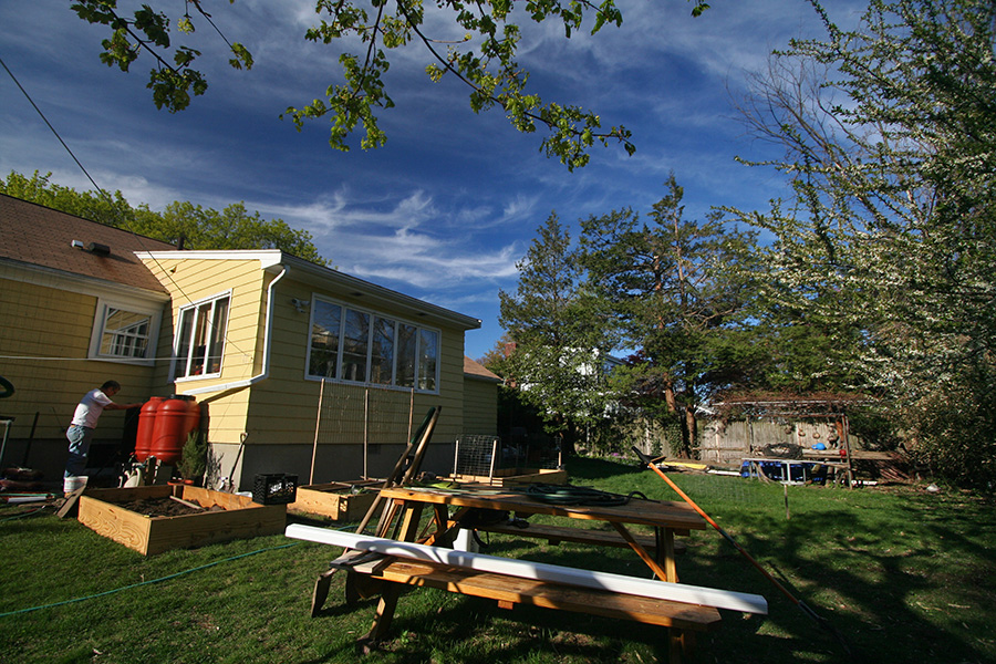 my sister helped out in preparing raised bed number 3. my father and i carefully removed the top layer of grass with shovels while my sister used the sod pieces to patch up bare spots in other parts of the lawn. this 4x8' plot was especially hard to dig up because of the many maple tree roots that snaked underground. it was also a bit rocky, haven't never been worked on over, and we collected several small plastic buckets full of rocks. there was also a fair share of grubs, which will assure a milky spore treatment come his fall to eradicate the beetle larvae hiding underground.