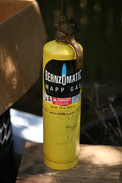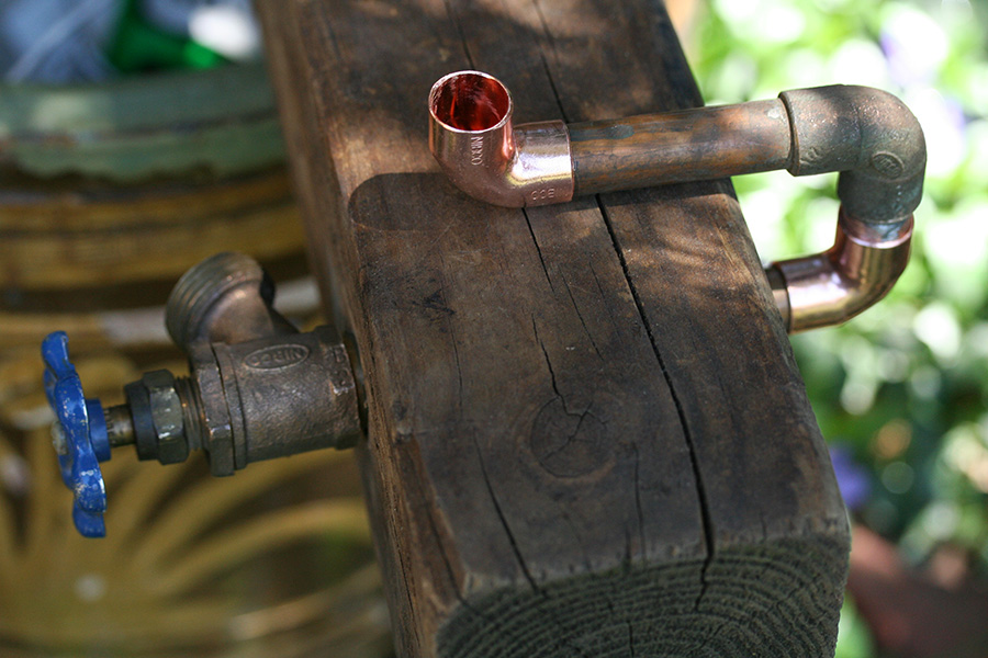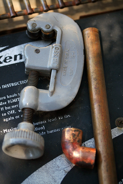 while my sister and i continued conditioning the soil in raised bed 3 (picking out the rocks and bits of tree rot, adding compost and topsoil and mixing everything together), my father was busy soldering the fancy pipe arrangement for the detached spigot. long story short, originally we thought it couldn't be done because there was no way to solder the copper pipe that close to the wooden post without burning it. but my father must've done some thinking last night and came up with a configuration that looked like it might belong on some brass musical instrument that it does as a piece of backyard equipment.