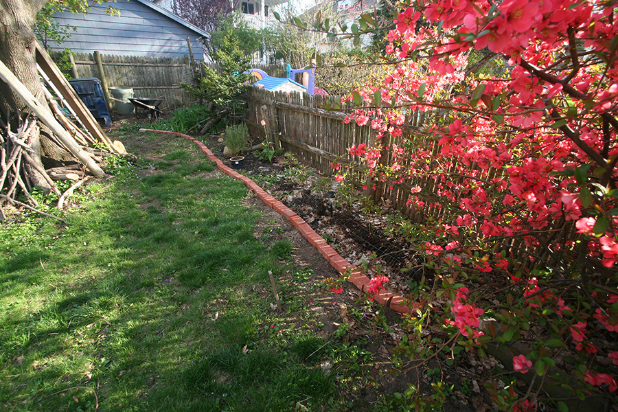 it's a nice look but i think we still need 100 more bricks before i can completely make it along the perimeter of the backyard. the area to the west of the house - where the raspberries and the money plants and the various irises and honeysuckles - are edged with old 4x4" posts. they're a lot easier to lay down (not as versatile though, can't make minute adjustments like i can with bricks) but because they're wood (even pressure-treated) they'll eventually rot and need replacing (that time is pretty much already here).