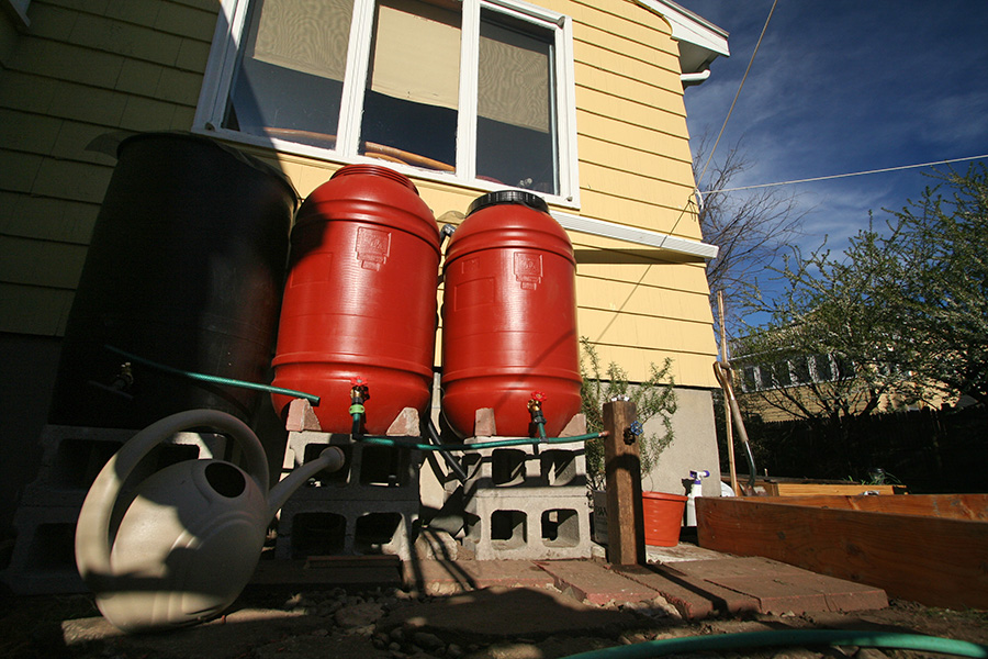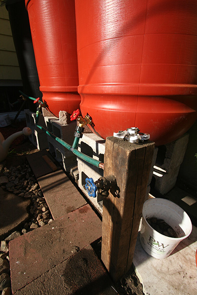 how we set up multiple adjoining rain barrels in the past (that sounds like we've been rain harvesting for ages but it's only been a few weeks) was one barrel would collect the rain water from the downspout of the house. when that barrel reached capacity, water from the overflow opening near the top would drain into the next barrel, which was a step lower to allow the forces of gravity to work. this method works but you end up creating a multiple-tiered steps of rain barrels. the other bad thing is since each barrel is independent, you end up with as many spigot choices (to get your water from) as there are barrels.