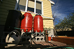 since the silicone caulking on the black barrel was still curing, we could only use the 2 preexisting barrels. the first test was seeing how fast a near empty rain barrel will fill up with water from a full barrel. we connected the hoses and turned on the barrel spigots. since these terracotta barrels have an open meshed top, we could look directly inside to see the water level rising. it basically took about half an hour for the two barrels to reach equilibrium.