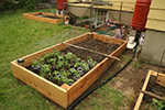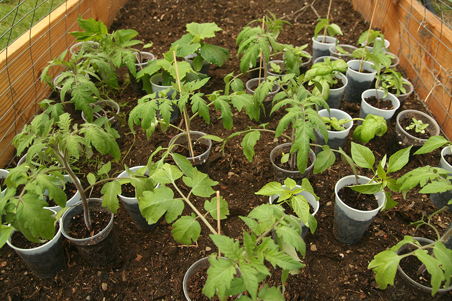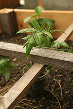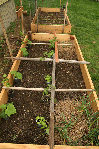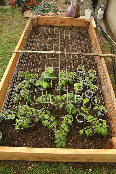 RB2 has already been laid out with vegetables that just need to be planted once they hardened up. i took a few of the droopy tomatoes and propped them up onto the wooden divider sticks.