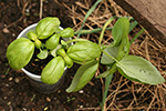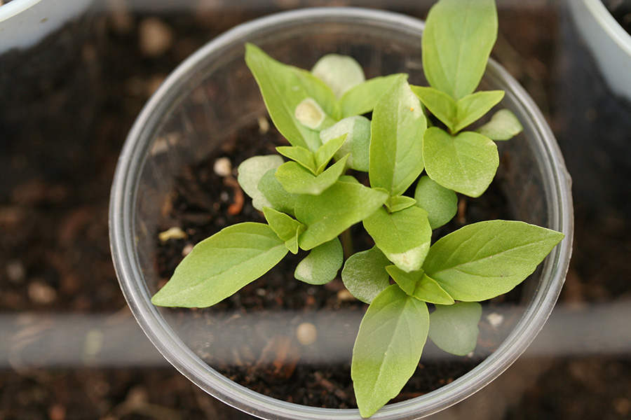 the only bad thing that's happened to the tomatoes and the peppers is they seem to have weak stems and instead of growing up some of them have been growing sideways. it's nice a big deal, i can just straighten them out when i plant them. the thai basil have some strange white spots on some of the leaves. it doesn't look like cold damage. is it some kind of mildew? hopefully they'll grow out of it, but i have plenty more seeds should these basils perish.