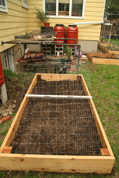 RB4 - the raised bed my father and i set up on monday - is still waiting to be planted. that will happen either tomorrow or saturday. plants are still hardening in RB3. i put a cage over it and these past few days my father has covered it with a tarp at nights to protect them from the cold. not sure if that's necessary, because some of the plants i set outside the staging area - cucumbers and basils - haven't shown any cold weather damage.