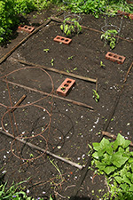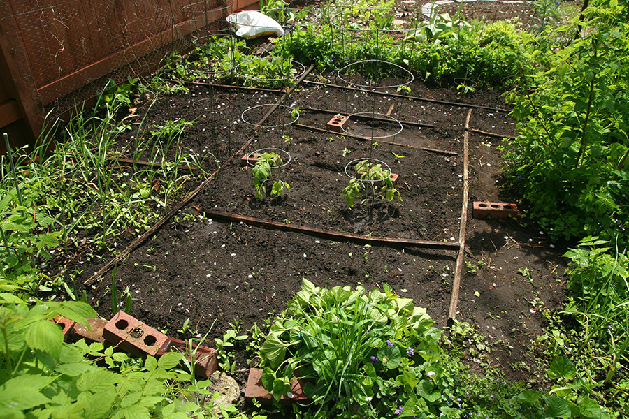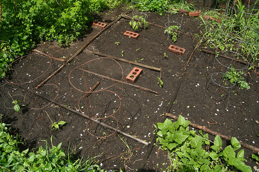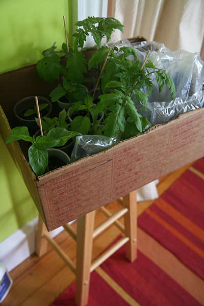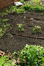 i walked to my garden to plant the box of vegetables i brought back a few days ago: 2 tomatoes, 4 hot peppers, and 2 thai basil. the basil needed to be thinned out so instead of throwing away the extra seedlings i planted them as well. if they survive i will have a total of 5 thai basils. it's good that i made a map of what i planted (seedwise) because i've already forgotten. before the mulberries ripen i'll need to lay down the salt marsh grass. hopefully all my seeds will have germinated by that point.