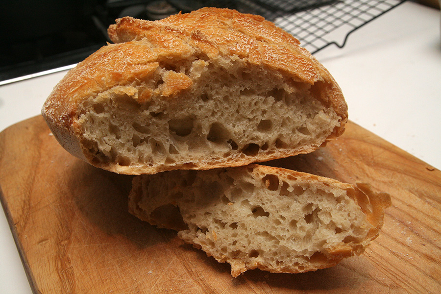 i was surprised by the final result. i sliced it open to inspect the inside. it had a hard crunchy crust but the inside was moist and spongy. even though the dough barely rose, the still came out pretty decent. it was good enough that i quickly managed to eat half a loaf. next time i'll use new yeast and will rise the bread suspended over a bowl of boiling water (a technique i learned online).
