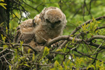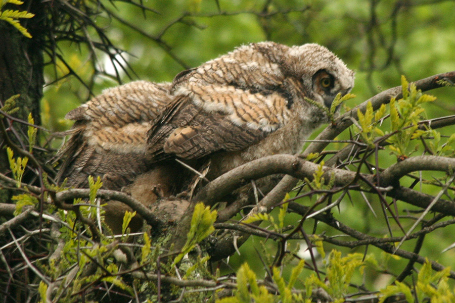 there were two great horned owl chicks, like a pair of fuzzy grey 2 liter soda bottles perched on a tree branch.