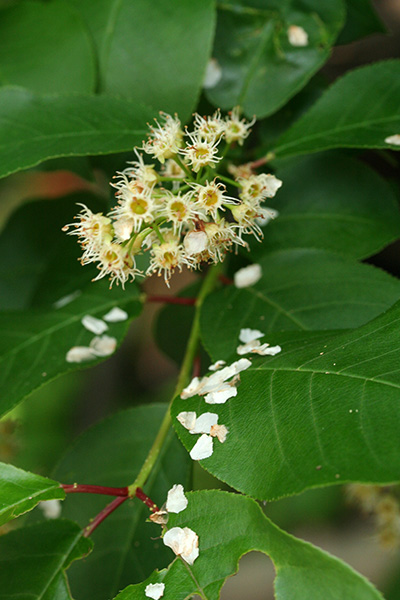 a small tree has sprouted besides the pussy willow. it has white flowers in a cone-like arrangement, with leaves born on red stems. the flowers don't really have any fragrance. i tried identifying the plant online but didn't find a match. it must've been there for a few years at least but i never really paid much attention to it until now.