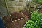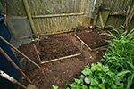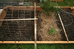 it was still just a pile of dirt but i partitioned it into 2 3x3 ft growing zones using some wooden stakes. in one square i planted some summer squash right in the middle (they need a lot of space, 3 ft radius is ideal) while in the other i packed in 4 rows of sweet corn. i put up some fencing but not sure if it'll really keep out the dog or any other animals. there's also really nothing keeping the dirt inside the square. after a heavy rainfall, i'm worried all that soil and compost will just spill over. this corner garden is basically a bonus area. it's not as ideal as the raised beds, so anything that i can grow here is just an extra perk.