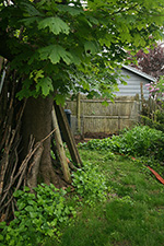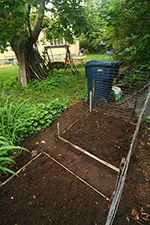 there used to be an apple tree at the southwestern corner of the yard. it was a dying tree bearing diseased fruits so my father and i chopped it down. we never did anything to the area, leaving what remained of the stump to rot and letting that corner become overtaken by celandines. a few years ago we took another look at that corner and realized it was a pretty good plot. the tree trunk had been naturally reduced to compost and the area got a surprisingly amount of sunlight. last year i successfully grew some sweet corn, before either a skunk or a raccoon completely razed my plants. this year we dumped out all the content of the compost bin so now the soil is super fertile.
