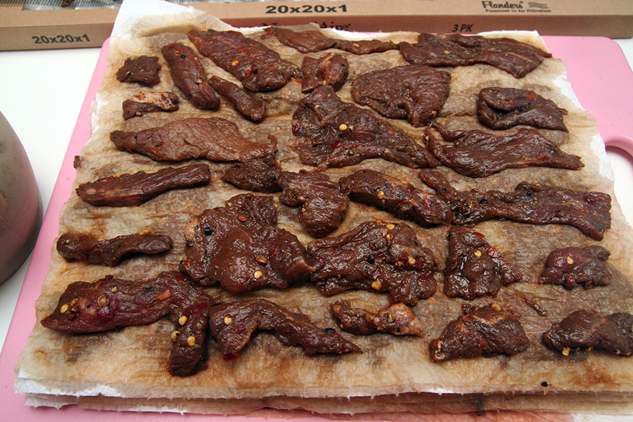 i checked the jerky status a few hours later. a bit of drying, but still very soft. i'll probably have to do a final cure in the oven. it's hard to slice the rump roast very thin, and the thicker pieces seem impervious to fan drying.
