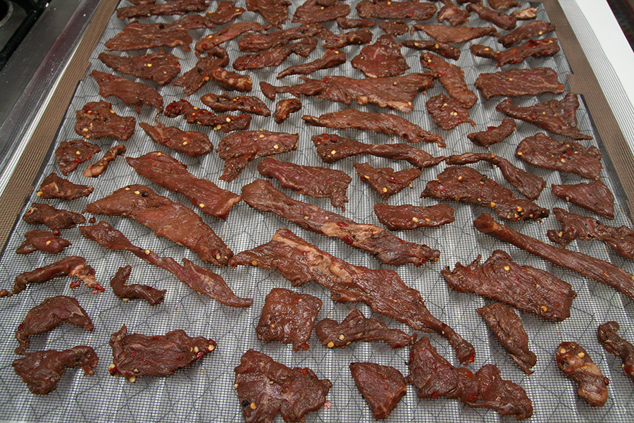 despite my best efforts to blow out the odor, soon the house smelled like beef jerky. some people might like the aroma but i'm not a fan. it doesn't exactly smell like barbecue; rather, it smells just like meat drying, thick with the scent of soy and worcestershire sauces. night jerky means i have to leave the fans on overnight. i hope i'll be able to fall asleep between the jerky smell and the fan noise. i also hope that no strange animals will try to get inside the house, drawn to the odor.