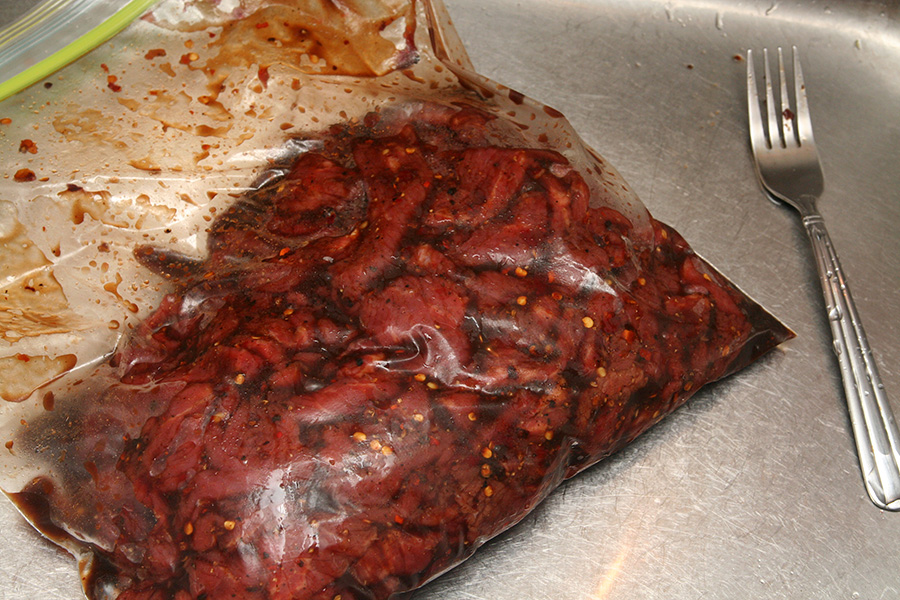 the jerky needs to be marinated between 3-6 hours. i chose the bare minimum, since i wanted to get dehydrating as soon as possible. i marinated at 5:00 so by 8:00 i was ready to dry the raw jerky pieces and place them onto the DIY dehydrator.