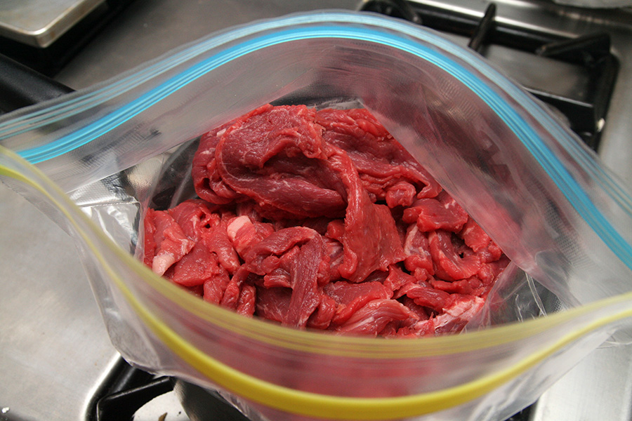 it was a weird image, me topless in the kitchen cutting up slices of beef. after i was all done, i added the marinade: