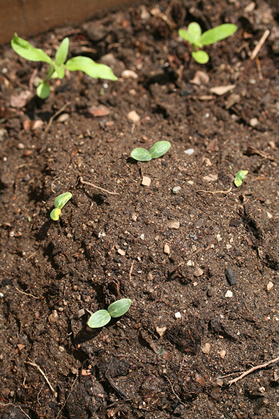 the main attraction of RB3 are the gourd/cucumber mounds, bisected with sunflowers. one of the pickling pickle mound has germinated, still waiting for the other one. none of the coccozella gourds have emerged yet. supposedly they're grow pretty fast, with 40+ days to maturity - that is if they'll even germinate.