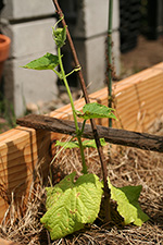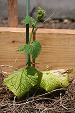 most of the garden drama is happening in RB2, home of cucumbers, tomatoes, and some basil. grey month of may has yellowed these plants. it's confused the hell out of the cucumbers that they're making flowers now, a sign of distress, when they almost don't have any leaves yet. in order to force the plants to go to back to growing, i pinched off all the flowers.