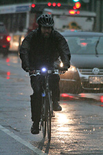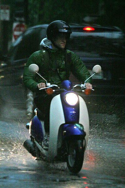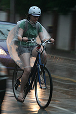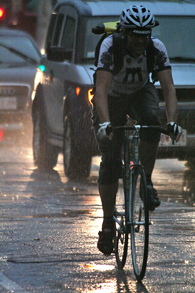 the sky turned ominously dark in the late afternoon. doppler radar showed a strong band of serious red. when it began to rain, i slipped on my flip flops, grabbed the umbrella, and went outside with the camera hoping to catch some seriously soaked cyclists. almost all the ones i saw rode bikes with 700cc wheels. everyone wore helmets, but not everyone had lights, even though it was dark enough that it might've been a good idea (i personally think lights are more important than a helmet). i saw a few topless male bikers; might as well, since all their clothes were wet anyway. there wasn't as much action as i'd hoped; i think most cyclists knew about the oncoming thunderstorms and probably decided to wait it out before heading home. i also saw some lightning which made me nervous. i got as far as dali before deciding to walk back.