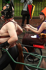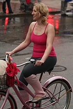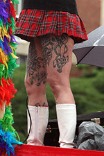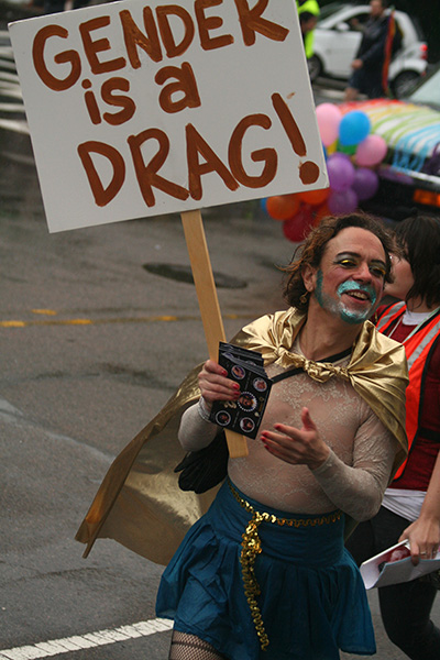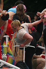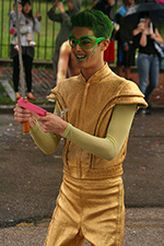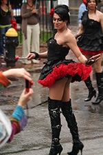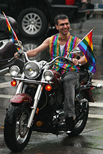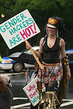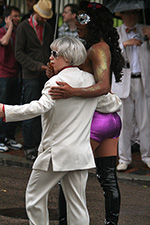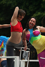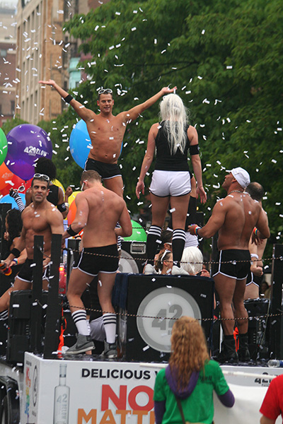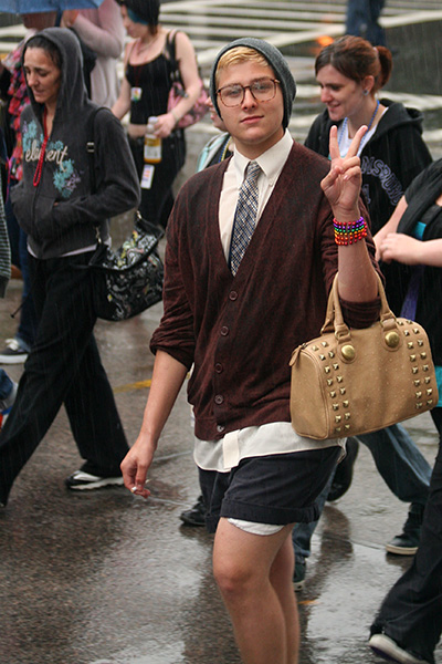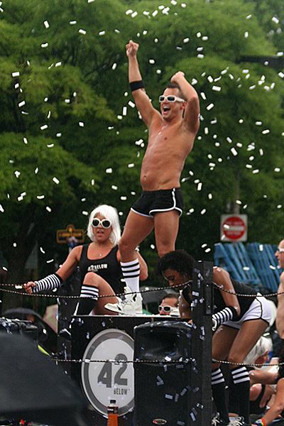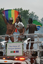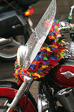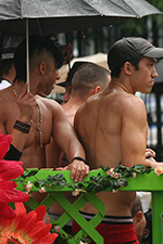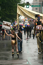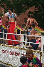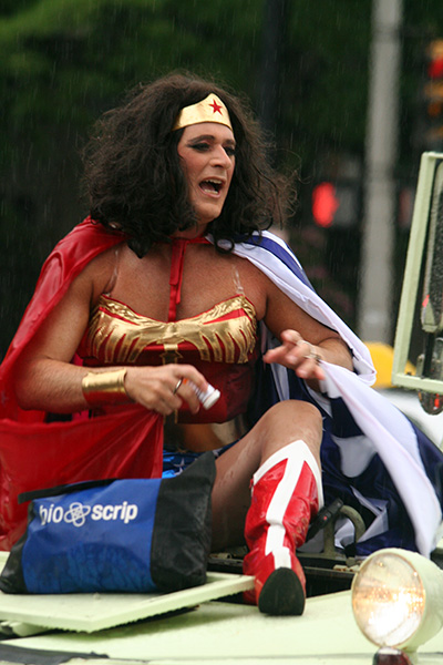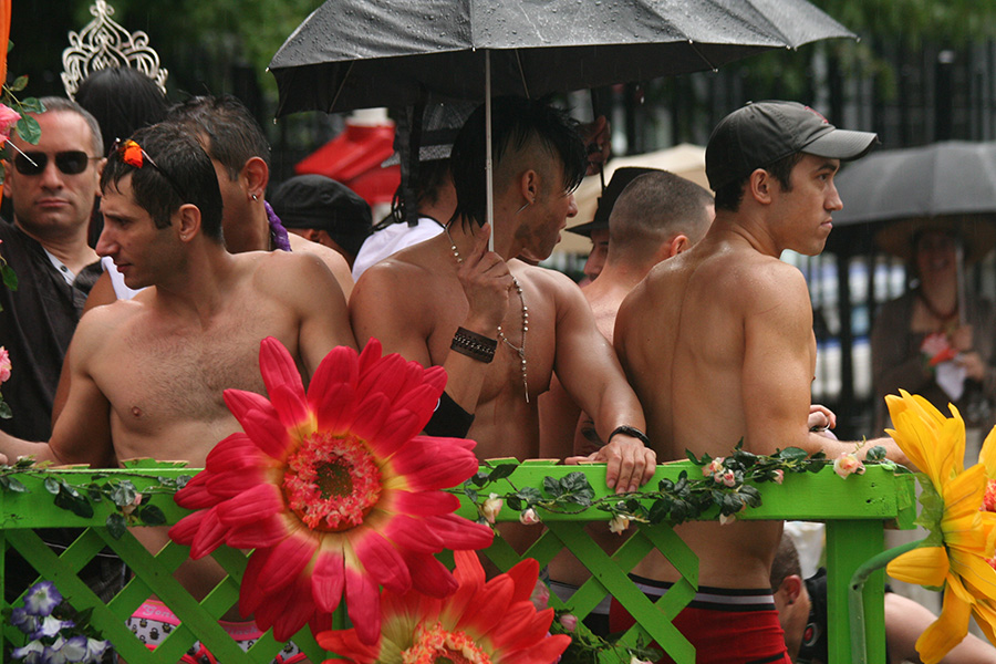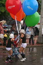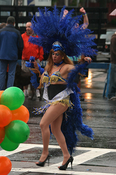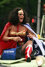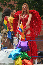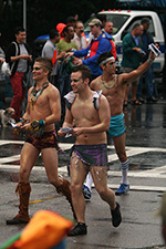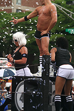 the pride parade is different every year. even in lean years, there's still a lot of spectacle to be seen. i'd say this year was about a mid-range parade in terms of pageantry. the strength of a parade can also be gauged from how much free tchotchke can be amassed. the beads were free-flowing this year, and basically anyone who wanted beads could get them. 2nd most common freebie were the safe sex packets, and i was given a few regardless if i wanted them or not. there was also a lot of candy, some rubber bracelets, balls, and (marshall) tote bags.