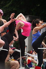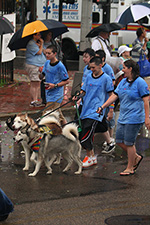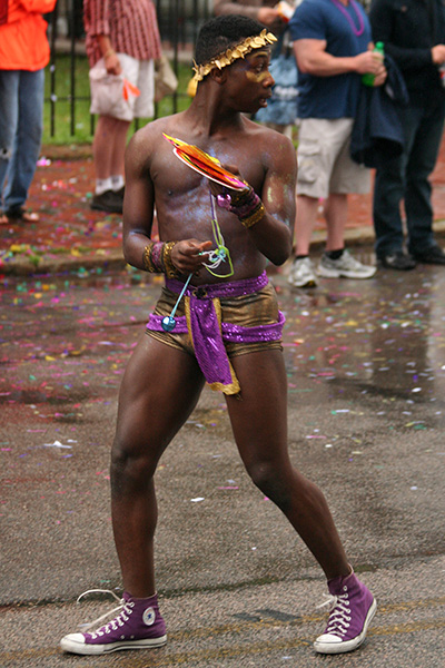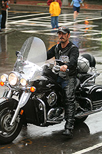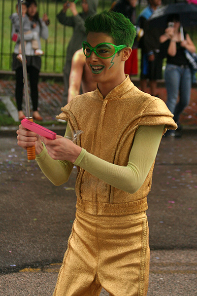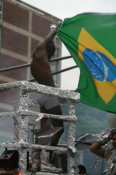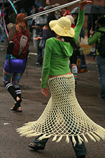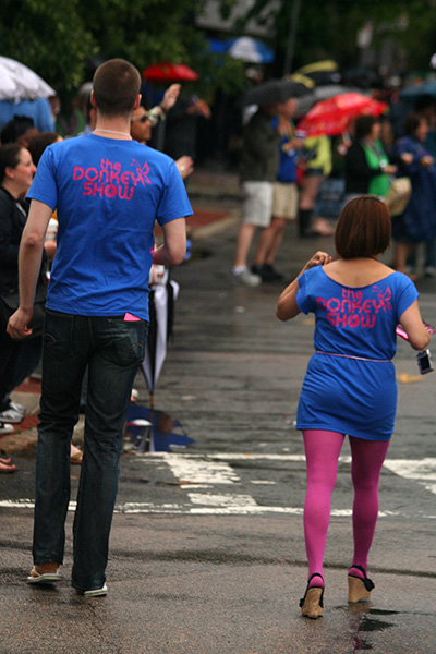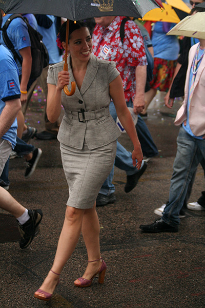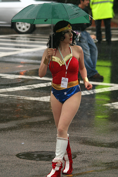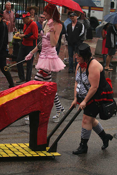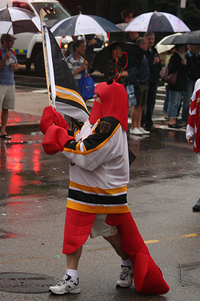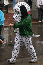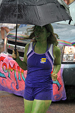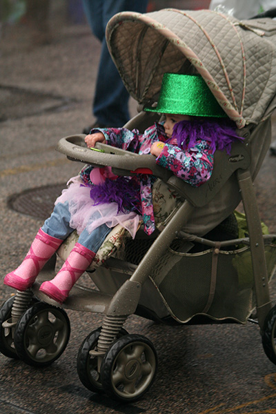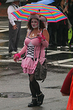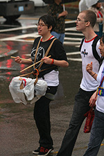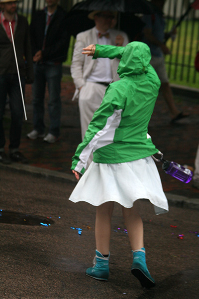 it wasn't just the rain: it was also cold and windy. i was bouncing to the music but only so people couldn't see i was shivering because i was wet and cold. fortunately i brought my hooded sweatshirt (in my grocery tote bag) but i didn't want to wear it until after the parade because i didn't want it to get wet.
