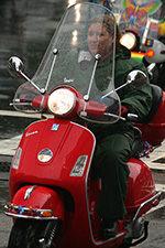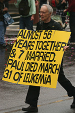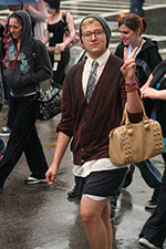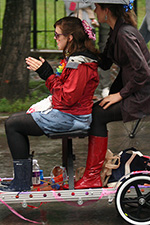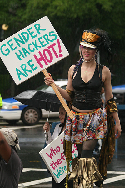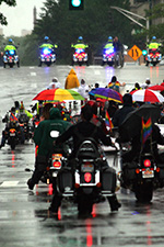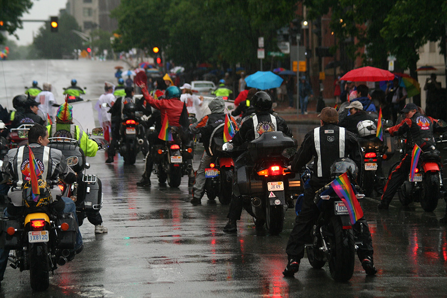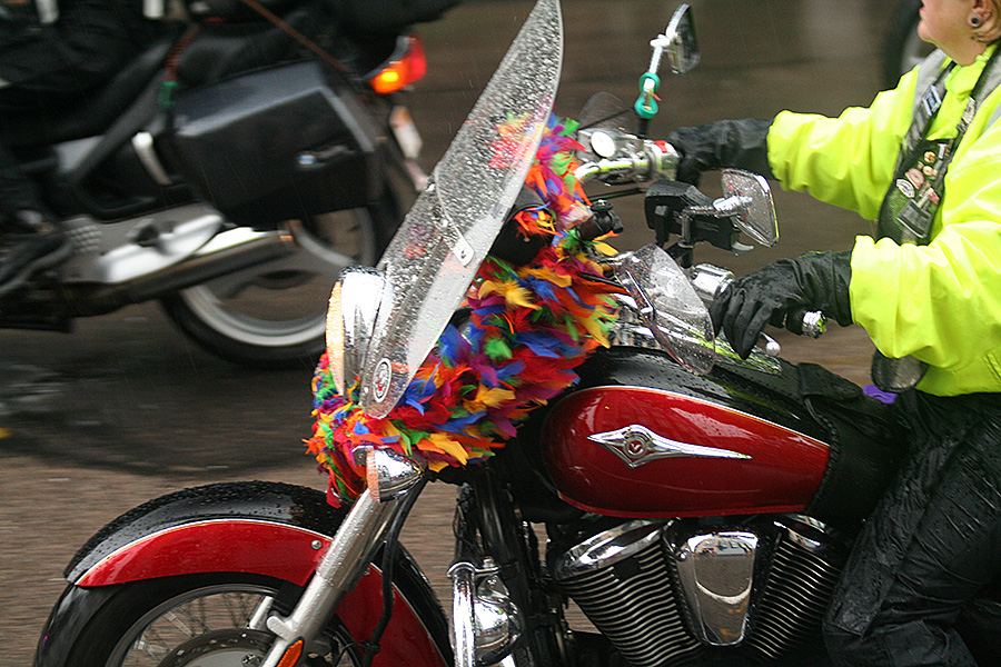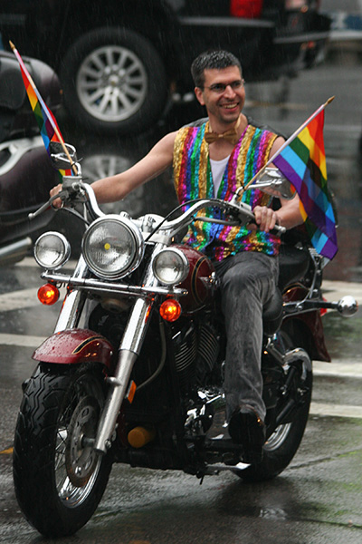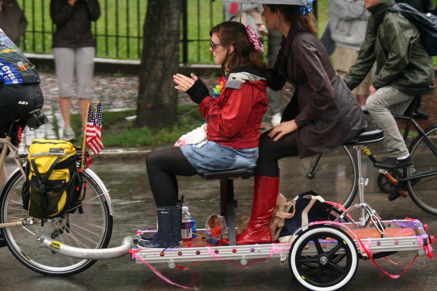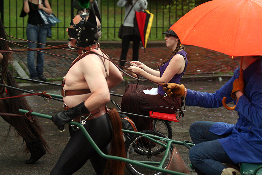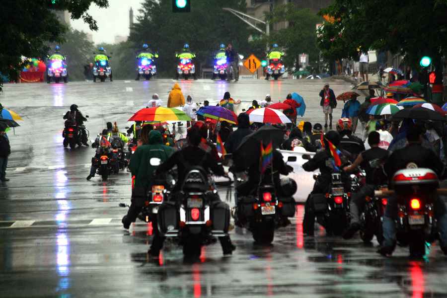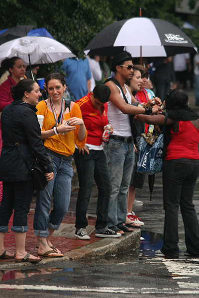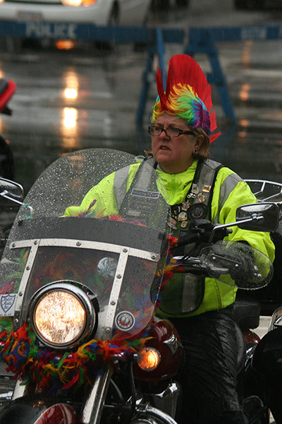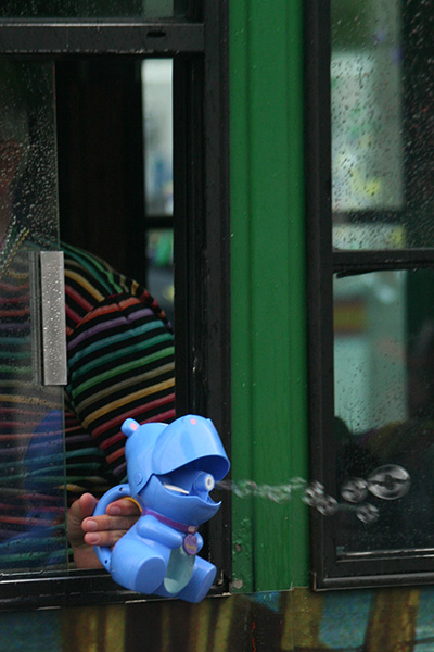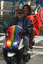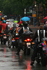 it's scary how promptly the parade begins. at exactly noontime i heard the revving of motorcycle engines as the lesbian and gay bikers kicked off the procession. i climbed onto the utility box for a better view, a spot i discovered last year. nobody else joined me, which was great (maybe also because the surface was all wet and nobody wanted to sit in the rain), but my view was still blocked on two separate occasions: an ecstatic woman waving a rainbow flag standing below up, poking the spokes of my umbrella a few times; and a couple pushing a stroller holding a large golf umbrella eclipsing my view. fortunately they were there only for a little bit and eventually moved away.