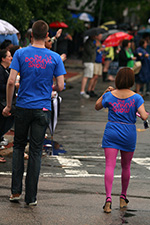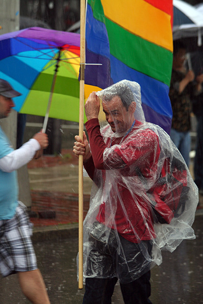 i pretty much had the best view ever of the pride parade but the rain dampened the photography because i had to shoot while holding the umbrella. it was hard to control the zoom; i basically pre-adjusted the focal length beforehand, then started shooting hoping i got the right factor of zoom. when i wasn't shooting, i was busy wiping off the rain from the lens and the barrel.