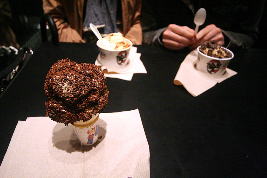 we decided to walk there, but everyone got their umbrellas ready just in case because ed's iphone weather app showed imminent storm clouds on the doppler radar. sure enough, it began to rain midway towards our destination. with the money left over from dinner, we used it up so everyone could get a special topping on their ice cream. i got a medium cappuccino crunch with jimmies ($5): the crunch comes from the coffee beans, medium was probably too large, and turns out jimmies are free. i also asked for a cone but they gave me a soft-serve cone instead of a sugar cone. and i was a little disappointed with the ice cream flavors (no burnt sugar flavor like at christina's in inman square).