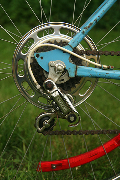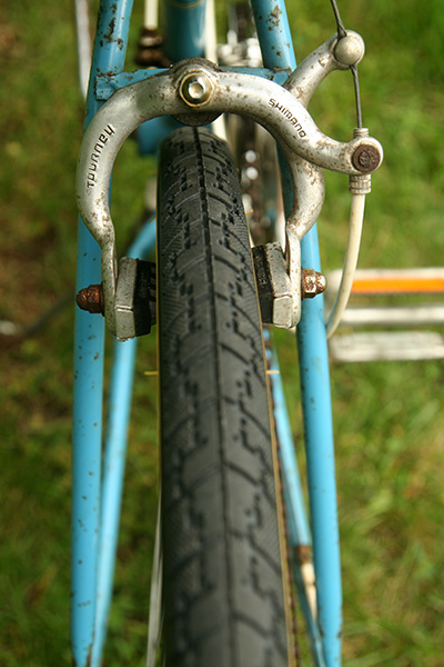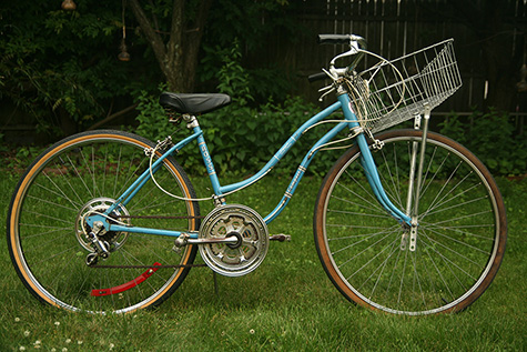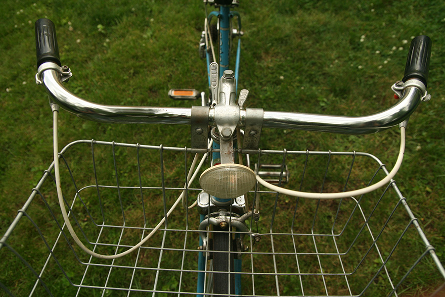 the front gear shift and rear brake cables still need to be replaced, but in the meantime the bike is perfectly functional so my father and i took it outside for a test ride. i can't really tell the difference that there's a front flywheel. only the rear shifter works, but at least that gave me 5 speeds. the front of the bike seems misaligned but that's only because the front basket is slightly askew, creating an optical illusion. both wheels aren't 100% true, but the brake pads are far enough apart that it doesn't rub against the rims from the very slight wobble.