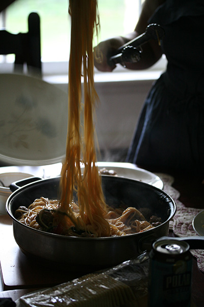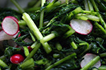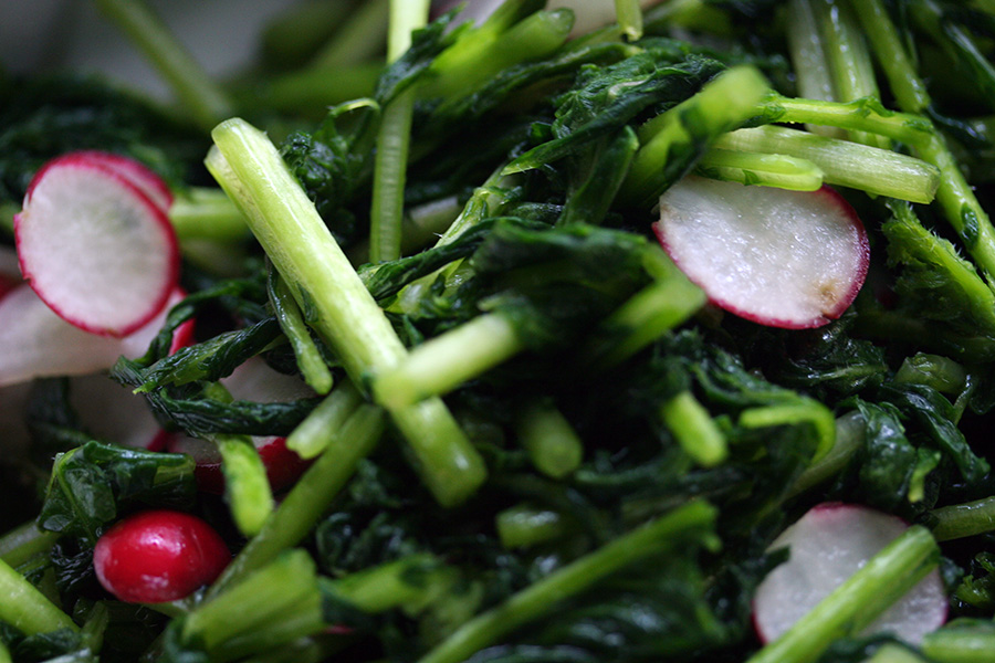 my family has been taking advantage of the bounty of leaf greens we've been growing this season. everyone loves the arugula, but my parents also like to eat the radish leaves when they uproot the radishes. often times there's so much leaf and so little actual radish that it makes sense to eat the leaves. the leaves themselves taste a little bitter (although my parents didn't think so) but cook well steamed. my parents eat the leaves raw, tossed with some salt.