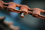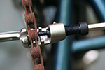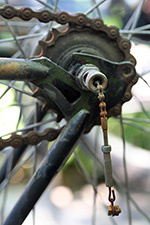 as for the chain itself, it was still stuck after blasting it at several points with WD-40. finally i decided to break the chain. i used the chain breaker on my bicycle multi-tool. i was surprised to see the pin so shiny and new when i pushed it out. even with the break, the chain still wouldn't come off. i had to break it again at another point before i finally managed to coax the rusty chain free.