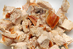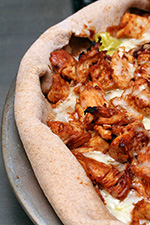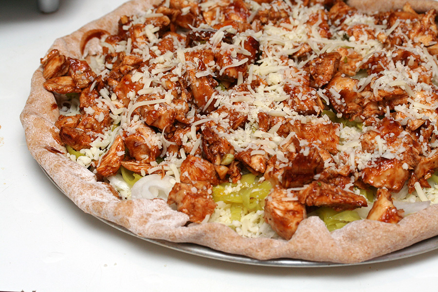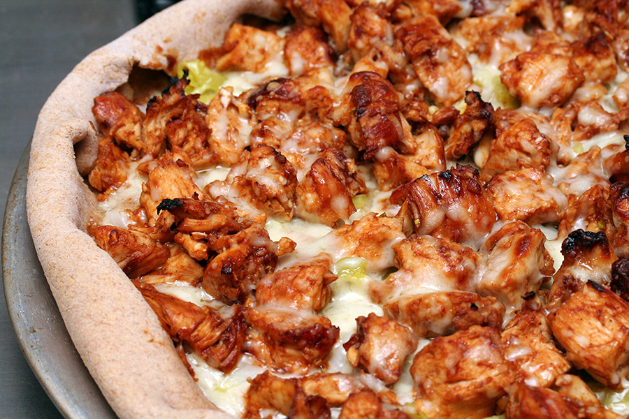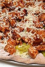 while i grilled my 3 chicken breasts on the foreman, i rolled the dough into a flat circle. later i chopped the onions and garlic; the garlic i tossed with the cubed chicken breasts and barbecue sauce. the cheese i used was some 4-cheese pizza cheese. i also added some hot pepper rings. into the 475°F oven went the pizza for 15 minutes. the result was pretty good, although i'm not happy with the crust. maybe it has something to do with the wheat flour, an entirely uninspiring substrate. the pizza was very gooey, more like a meat pie. i ate it with a fork, unable to lift a slice without having it fall apart. later, on my second slice, after it'd some time to cool, was i able to hold it in my hand like a real pizza.