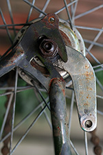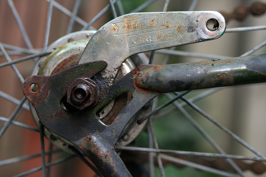 since the rear wheel of the raleigh 3-speed was basically beyond saving, i figured at least i could still remove the hub gear, which seemed to be fine. in the process, i basically disassembled the bike down to its frame: i took off the shifter, removed the fenders, detached the wheels, and pulled off the tires and inner tubes. seeing the rear rim in all its rusted out glory was something scary. the rust on the outside can be brushed off, but it's the inside rust that's impossible to fix. i took took another look at the hub gear: it's a sturmey archer S3C - 3-speed coaster brake hub.