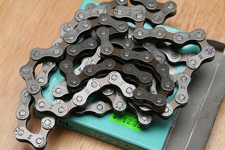 after a cream cheese bagel for lunch i left for the bike store to pick up a new replacement chain. i bought a z chain model Z50 (KMC 116L 1/2"x3/32" 18-21 speed index) for $12.99. there was another model that came with a quick release chain link and zinc galvanized but i didn't want to pay $2 extra. i bought another chain from them before (11/2009), a Z51, same price, but it came with the quick release chain link.