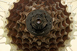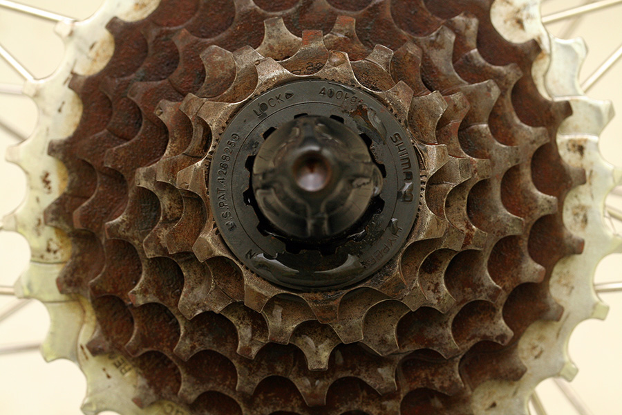 the rear derailleur and the cassette needed to be cleaned up as well. i brushed off as much rust as possible, lubricating with both WD-40 and dishwashing fluid. i took off the rear wheel completely and tried to give it a thorough cleaning in the bathtub. i managed to get some of the rust off, but it's still rusty. the only way to a good cleaning is completely disassembling the cassette, and that could be a pain.
