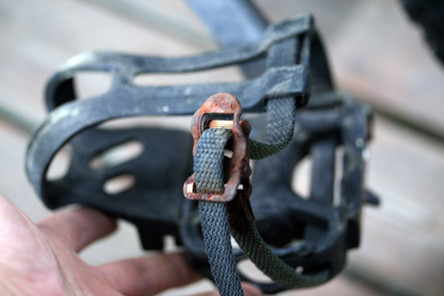 the bike also came with a toeclip and strap but only on the left pedal. i don't know if that was intentional. i never used toeclips/straps before, so i was curious how it'd feel. i always thought they were gimmicky, like stirrups for your bicycle, but they do help somewhat with the upstrokes when you're pedaling. i am however worried that my feet would get caught and i'd topple off the bike if i ever came to a sudden stop. the strap also drags on the road if i pedal without using them (stepping on the other side).