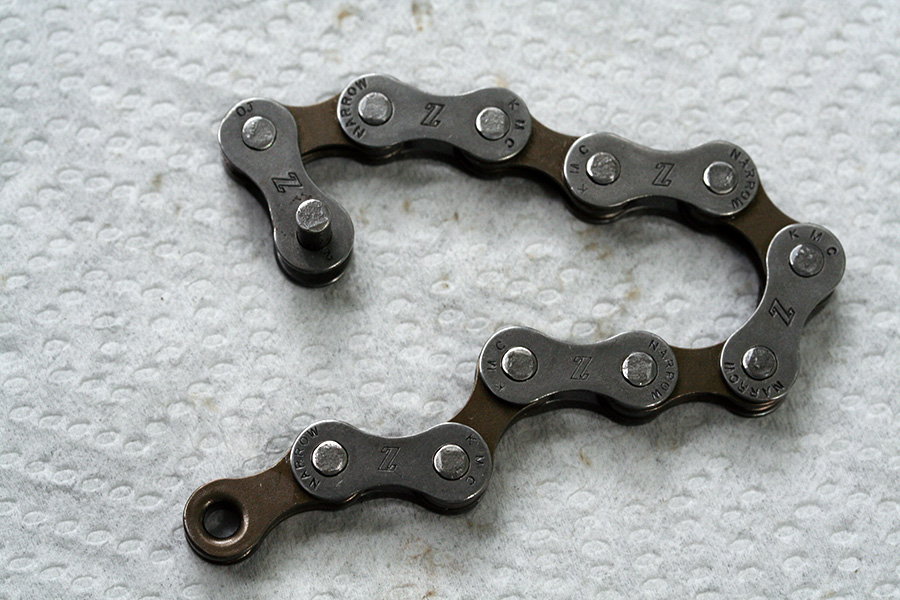 before i could put on the new chain, i first had to find out what length i needed. the old chain was still badly rusted, and i couldn't bend it straight enough to easily figure out the total length. i soaked it with some degreaser but that did nothing (i should really soak it in WD-40). finally i attached all the old chain links together and just counted the length in links.