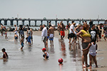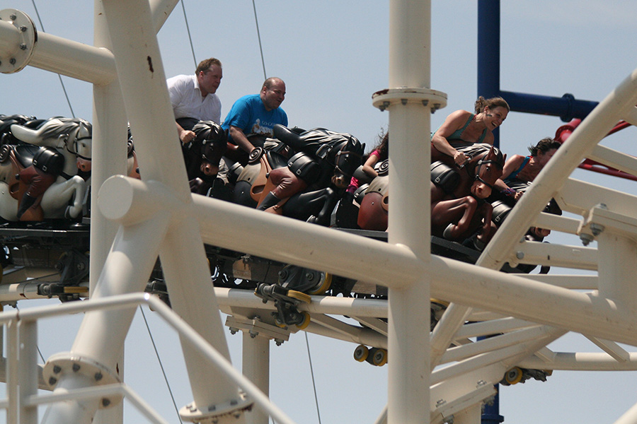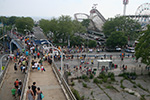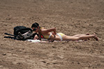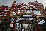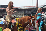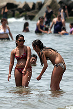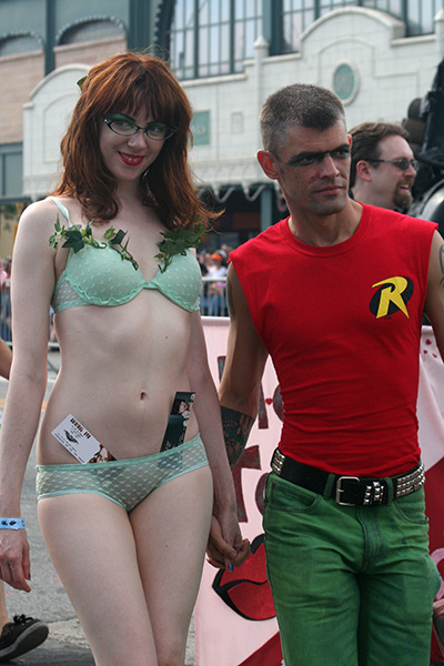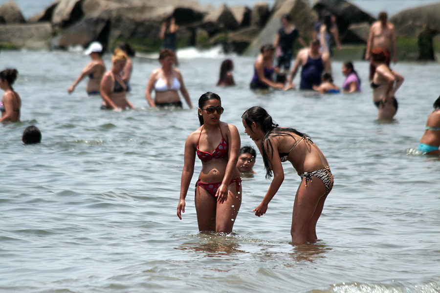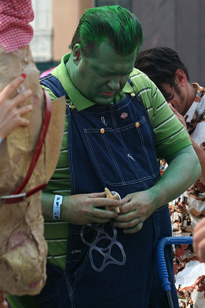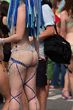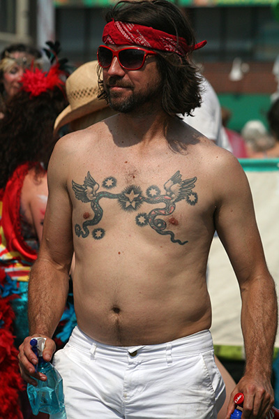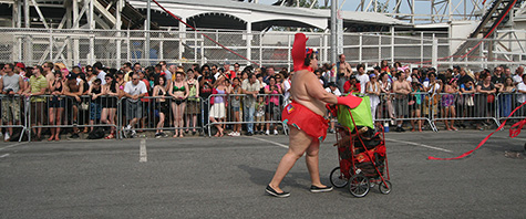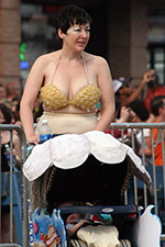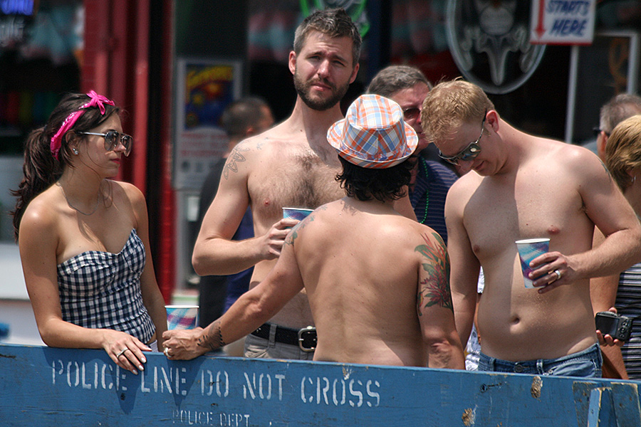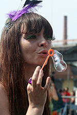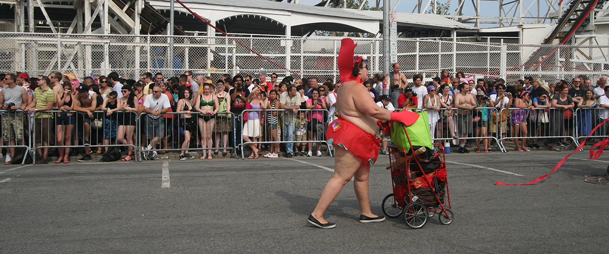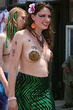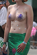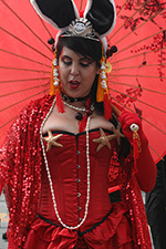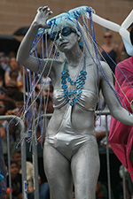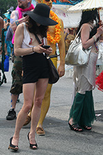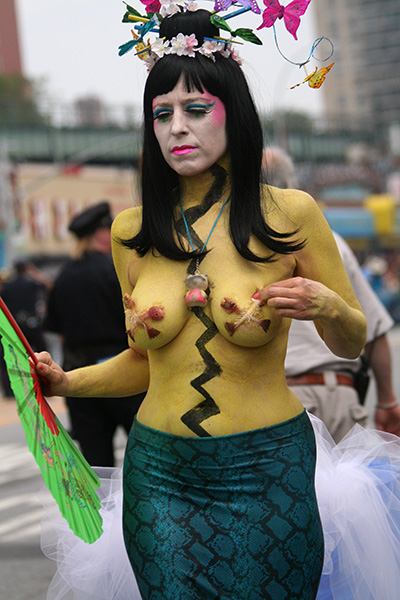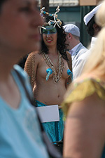 stepping off the train into coney island station on mermaid parade day is a shock to the senses. suddenly you're in a sea of costumes, flesh, glitter, piercings, and tattoos. this being my 6th mermaid parade (2006 2007 2008 2009 2010), i played it cool, putting on my jaded mien. already people were lining up down both sides of the parade route. out of the station, for a second i thought i was lost. since my last visit, developers had razed a vast swath of buildings, hidden behind muraled plywood fences. gentrification is a cruel mistress. we wandered through the amusement park (at least that's still there for now) and then to the beach. huang lie said her mother would get a kick out of some the rides, since both her parents were in the military (just like boot camp training!). at the beach huang lei rolled up her pants and put her feet in the cold water. she'd been to the beach one other time, to revere beach, but she said this was better. with about an hour to go, huang lei suggested we go back so we could get a good spot. it was already crowded, but we found one of the only few spaces behind a long strand of metal barricades. now we wait.