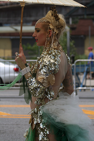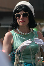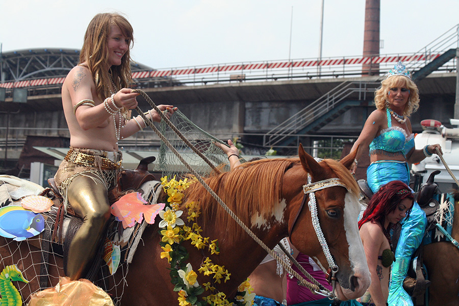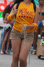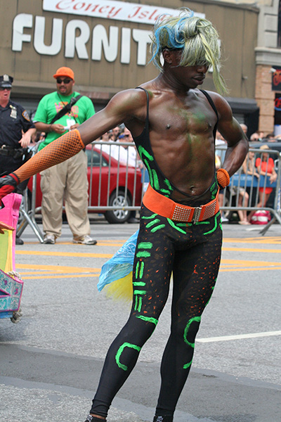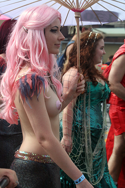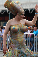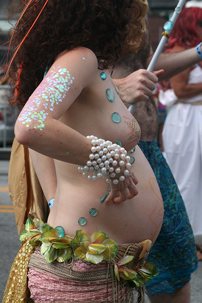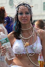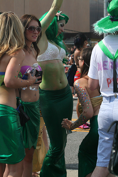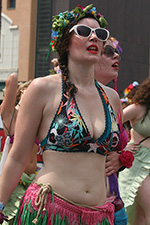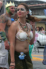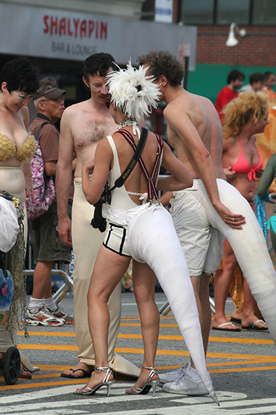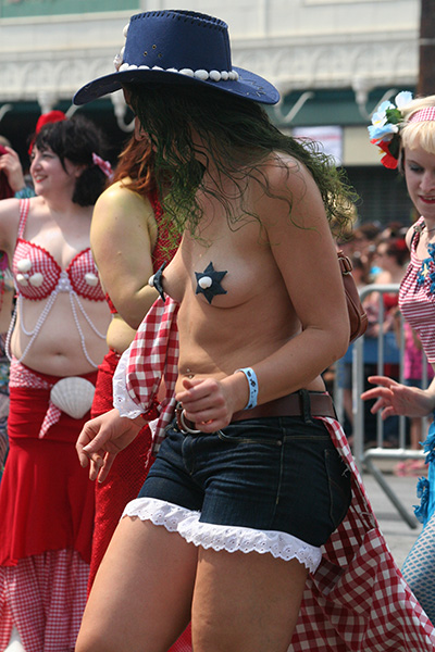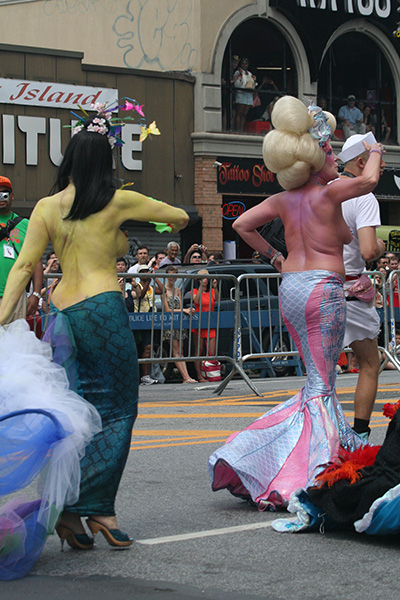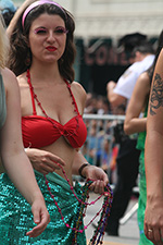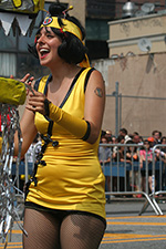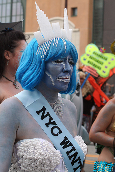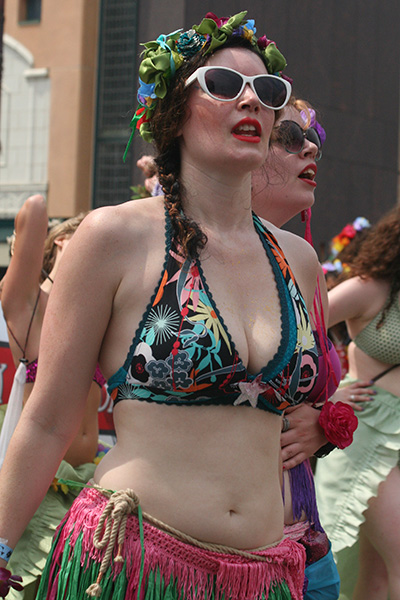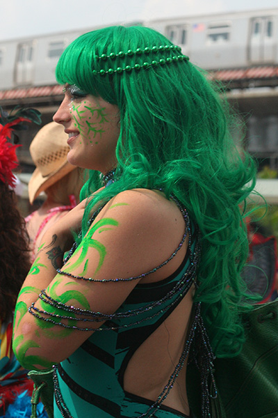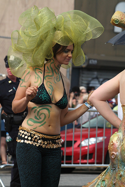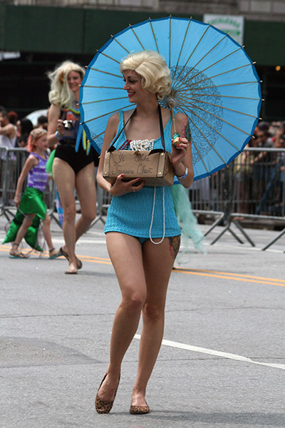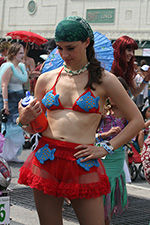 i don't mind the standing (i could always leaning on the barricades) but the heat and the thirst is a different story. weather is always a deciding factor when it comes to parade success, but the mermaid parade works just as well dry or wet. rain is only a pain for photography (and the danger of getting poked in the eye with an umbrella spoke). when it's too hot though, standing on the sideline can be unbearable. today was hot but it wasn't too bad. the sun would come out from time to time, but mostly it was a warm haze, very good for shooting. i kept looking for a rolling refreshment vendor that never came, and i didn't want to step out and go to a store because i didn't want to lose my spot.