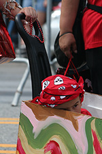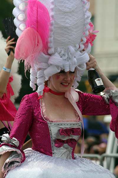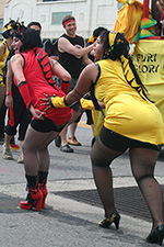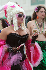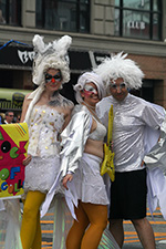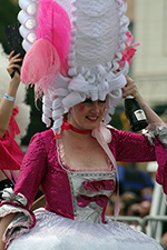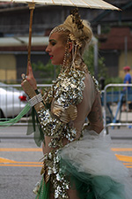 we didn't see the parade procession until almost 2:30. where i usually stand is right across the street from the train station exit. that way i can see all the costumed people coming out, sort of like a sneak preview. this time i camped out a little bit further ahead. this is actually the better spot because it's not near the intersection that always seems to swell with people when end up crowding into the street. the police also set up the barricades different this time. people on the north side had to stand behind a double barricade of wood and metal, which meant they were a full lane car lane behind the folks watching from the southern side. i thought they'd move forward the barricades once the parade started, but they never did (i guess it's for emergency reasons why they keep one lane open). that meant the parade marchers were mostly focused on our side of the street, preening and posing for cameras.