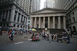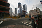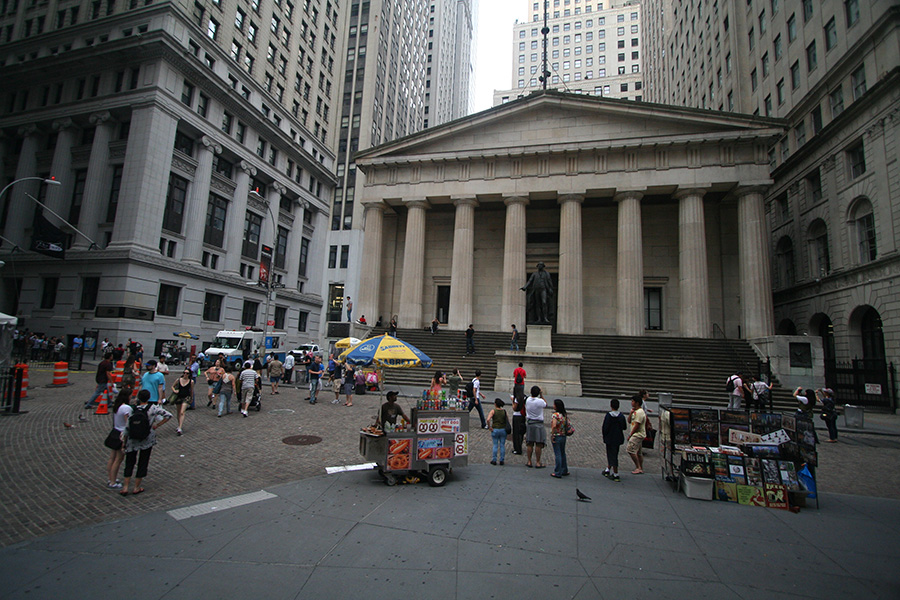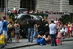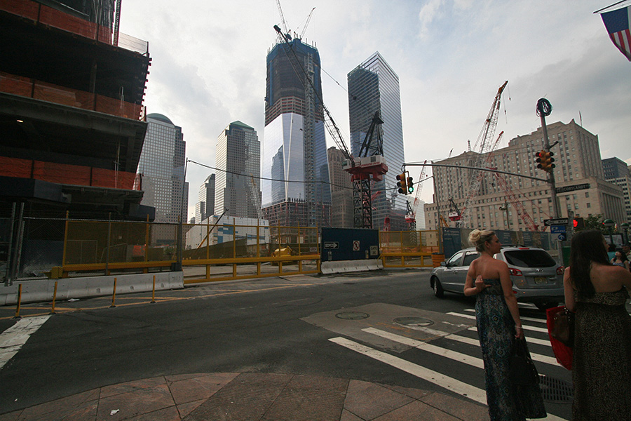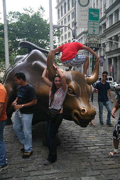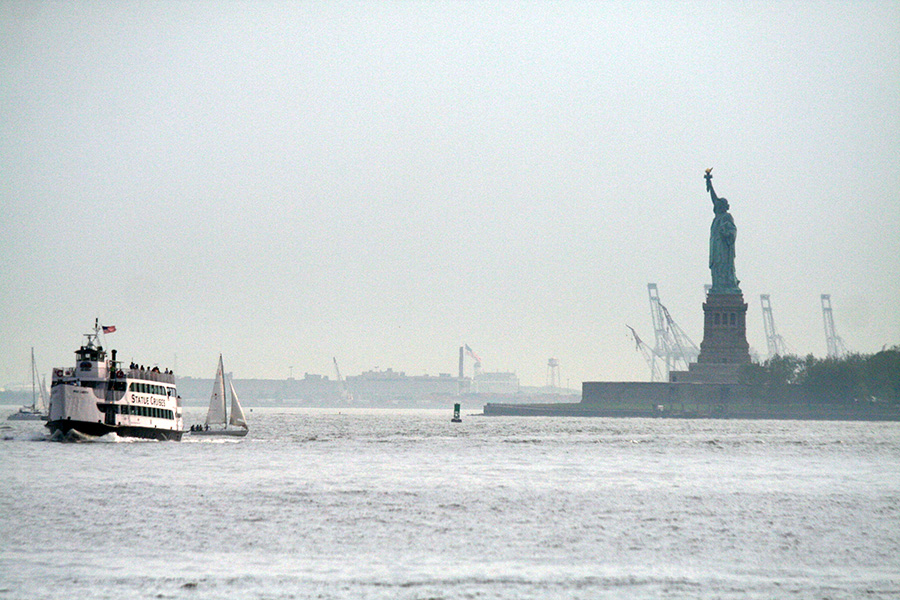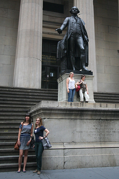 after using the bathroom at syms (where a suited security guard followed me around the store while i waited for huang lei), we first visited the world trade center site, followed by trinity church (it was closed by that point, 6:00). a short walk led us to wall street, then another distance was bowling green, site of the charging bull. huang lei was intrigued by the statues outside the old customs house after i told her how each represented a different world region (americas, europe, africa, asia). we went to battery park to see the statue of liberty from the shoreline.