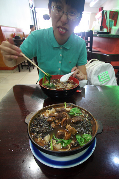 she was most amused by the numerous chinese chain restaurants that were also found in shanghai. we ended up having an early lunch at that noodle place i always go to, king of casserole (21 division street). there are plenty of other noodle places in chinatown, but the one time i deviated from the norm it wasn't a good experience, so i keep coming back to casserole. they're also one of the few places that's actually opened at 10:00, and a decent bathroom, 2 important criteria. huang lei got the hand-drawn beef tendon soup while i got the knife-cut lamb noodle soup. it wasn't that good and the only reason why i finished was i was hungry.