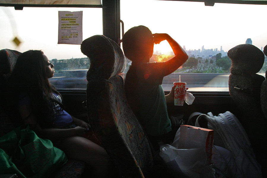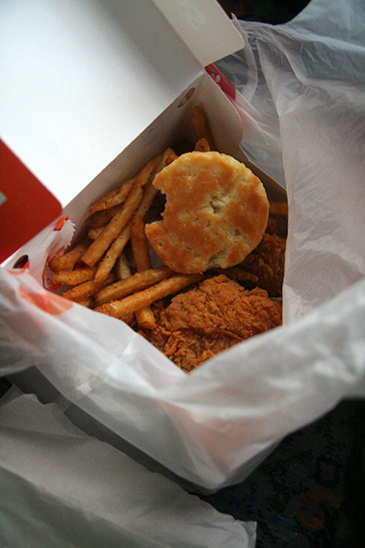 we went next door to the popeye's to get some fried chicken takeout. we got out just when the bus arrived and they began boarding. there was enough space on the bus so that everyone could have their own pair of seats. i stretched out, relaxed, and ate my tasty fried chicken with the air conditioner blowing overhead and the bus lurching towards home.