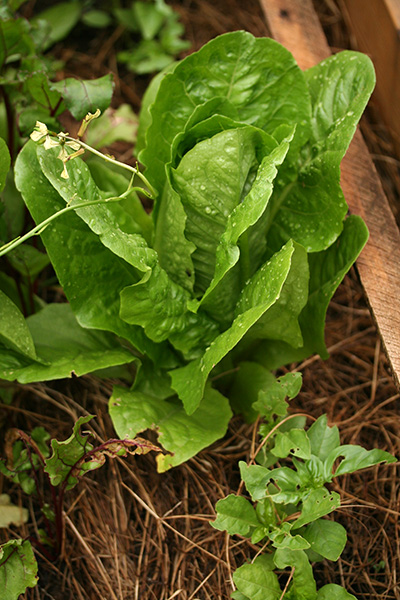 the single remaining head of romaine lettuce looks oh-so-crispy. it looks too good-looking to eat. there are other romaine plants but because they were grown too close together, none of them have developed into a head.