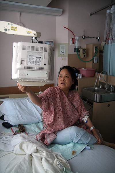 not even a receptionist or a security guard. we went to the 4th floor of the south building. my mother was sprawled out on a hospital bed next to a window, in an empty room that can sleep a total of 4. she had food at the hospital but her doctor put her on a restricted diet so the fish she ordered was very bland. good thing we brought her some stuff from home, including some leftover pasta and a container of bing and rainier cherries. every bed was outfitted with a 35-channel tv mounted on a swivel arm. one channel had a dedicated camera feed of the nearby charles river. we stayed for about an hour before leaving. my mother thinks she should be able to go home tomorrow but that's what she said yesterday.