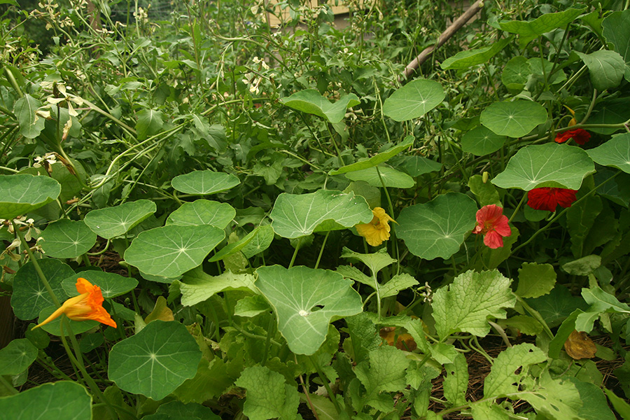 the nasturtiums are amazing. today in the garden i saw 4 different colors of flowers: red, orange, yellow, and pink. pink and yellow are new to me, i've only ever seen orange and red. once all the arugula and radish and lettuce are gone, RB1 can be a field of nasturtium for all i care, if they continue with the color show.